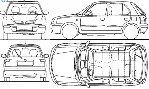1992 Nissan Micra Hatchback blueprint drawing, 1992 Nissan Micra Hatchback diagram wrap template for 3d artists and 3d modeling, free views |